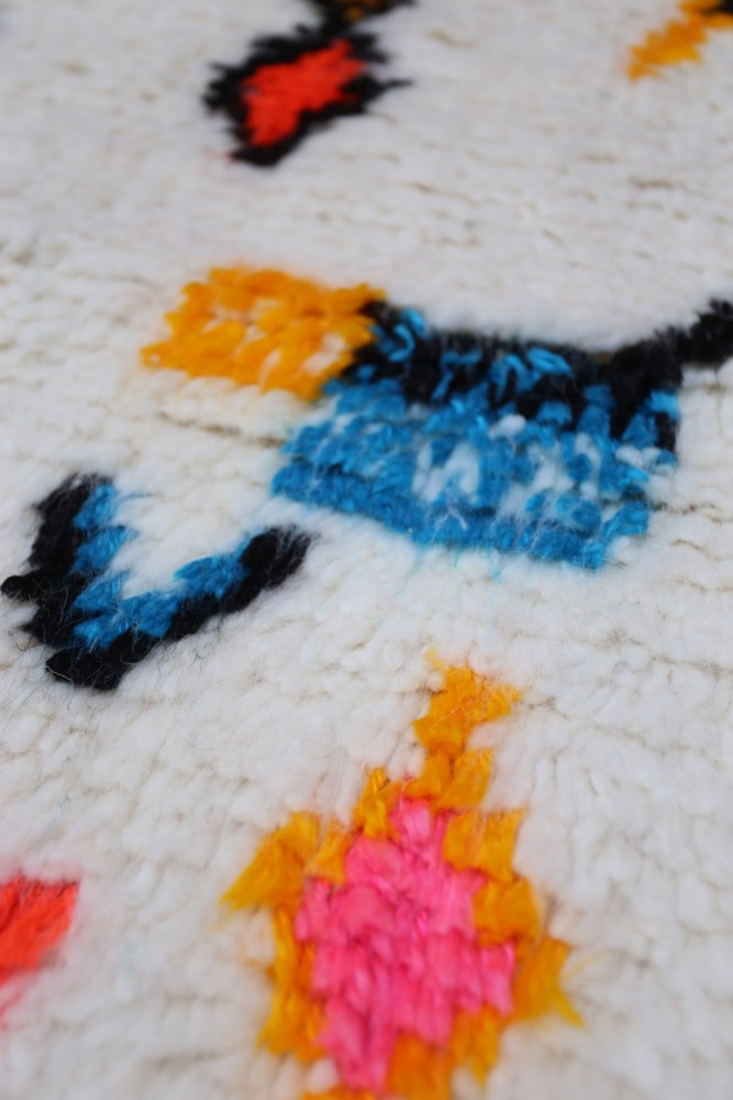 Esta alfombra bereber llamada Azilal recibe su nombre de la región de Azilal en Marruecos, donde ha sido confeccionada a mano en un telar tradicional de madera. Sus diseños representan los estados de ánimo, amores y penas de la tejedora en el momento de su creación. Una vez que se ha creado esta alfombra bereber de colores, ella creará otra totalmente diferente, dependiendo de sus emociones en ese momento. Cada pieza es única.