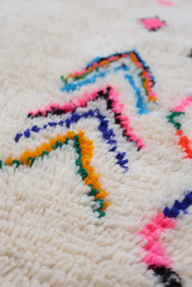 Esta alfombra bereber llamada Azilal recibe su nombre de la región de Azilal en Marruecos, donde ha sido confeccionada a mano en un telar tradicional de madera. Sus diseños representan los estados de ánimo, amores y penas de la tejedora en el momento de su creación. Una vez que se ha creado esta alfombra bereber de colores, ella creará otra totalmente diferente, dependiendo de sus emociones en ese momento. Cada pieza es única.