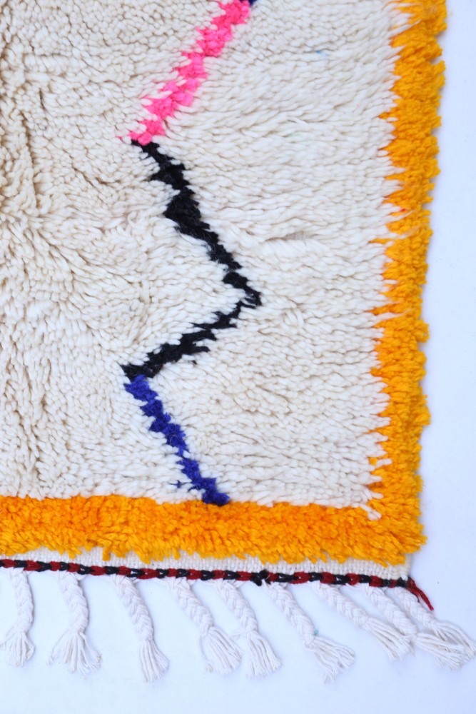 Esta alfombra bereber llamada Azilal recibe su nombre de la región de Azilal en Marruecos, donde ha sido confeccionada a mano en un telar tradicional de madera. Sus diseños representan los estados de ánimo, amores y penas de la tejedora en el momento de su creación. Una vez que se ha creado esta alfombra bereber de colores, ella creará otra totalmente diferente, dependiendo de sus emociones en ese momento. Cada pieza es única.