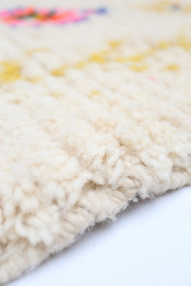 Esta alfombra bereber llamada Azilal recibe su nombre de la región de Azilal en Marruecos, donde ha sido confeccionada a mano en un telar tradicional de madera. Sus diseños representan los estados de ánimo, amores y penas de la tejedora en el momento de su creación. Una vez que se ha creado esta alfombra bereber de colores, ella creará otra totalmente diferente, dependiendo de sus emociones en ese momento. Cada pieza es única.