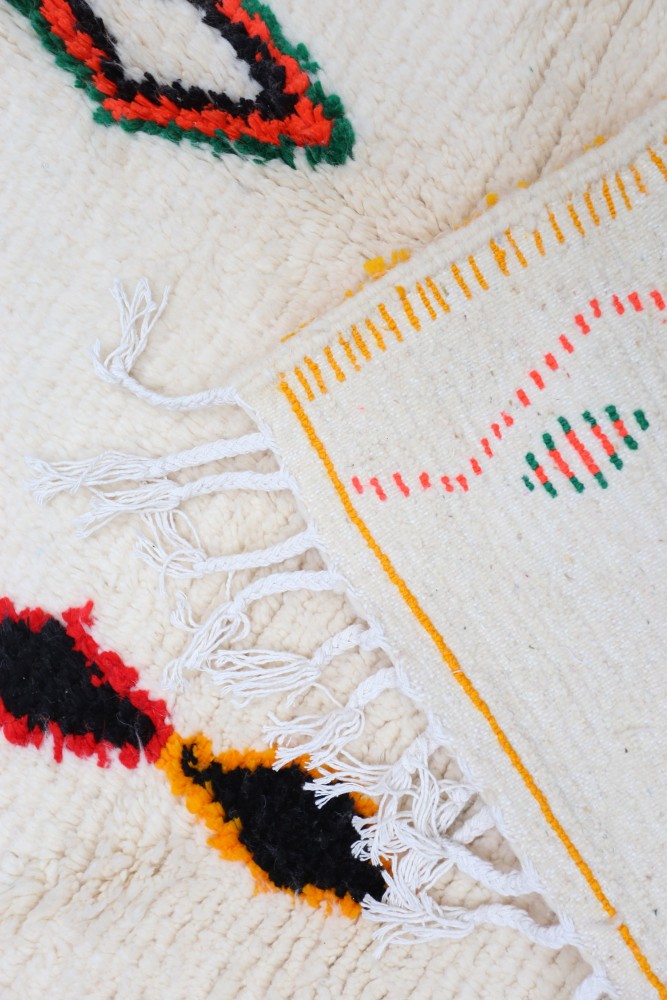 Esta alfombra bereber llamada Azilal recibe su nombre de la región de Azilal en Marruecos, donde ha sido confeccionada a mano en un telar tradicional de madera. Sus diseños representan los estados de ánimo, amores y penas de la tejedora en el momento de su creación. Una vez que se ha creado esta alfombra bereber de colores, ella creará otra totalmente diferente, dependiendo de sus emociones en ese momento. Cada pieza es única.