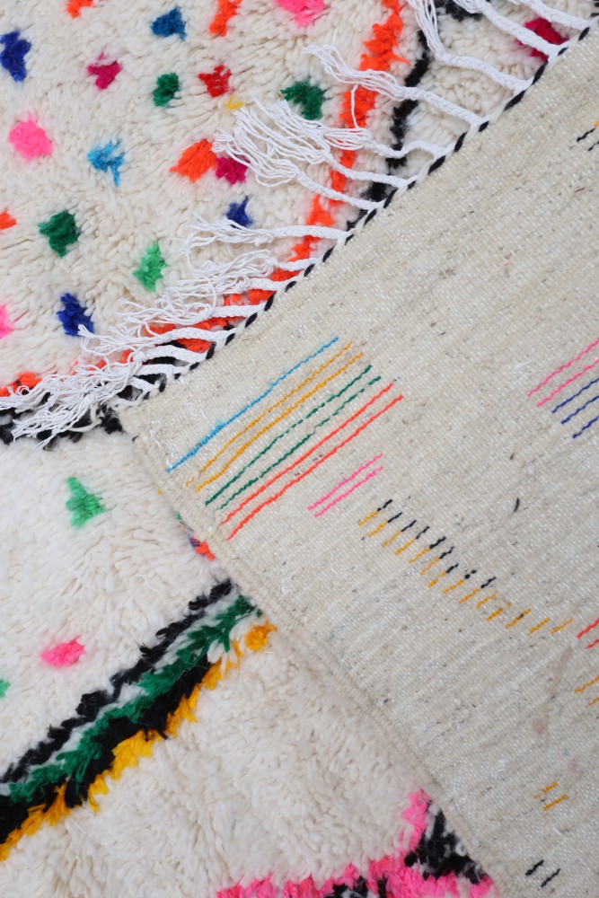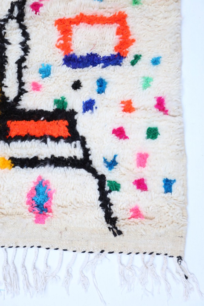 Esta alfombra bereber llamada Azilal recibe su nombre de la región de Azilal en Marruecos, donde ha sido confeccionada a mano en un telar tradicional de madera. Sus diseños representan los estados de ánimo, amores y penas de la tejedora en el momento de su creación. Una vez que se ha creado esta alfombra bereber de colores, ella creará otra totalmente diferente, dependiendo de sus emociones en ese momento. Cada pieza es única.