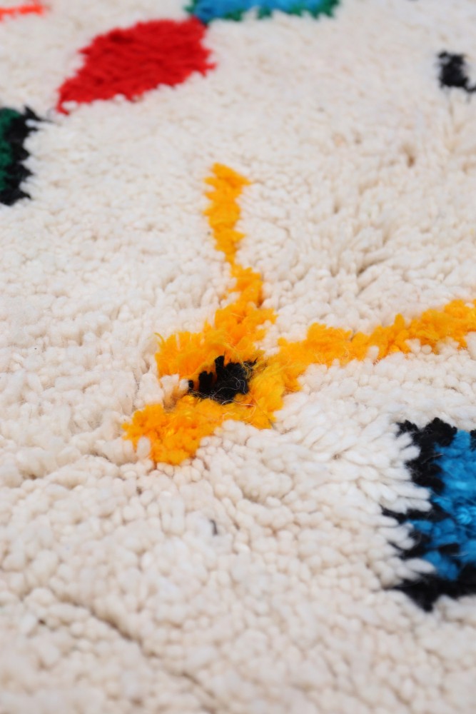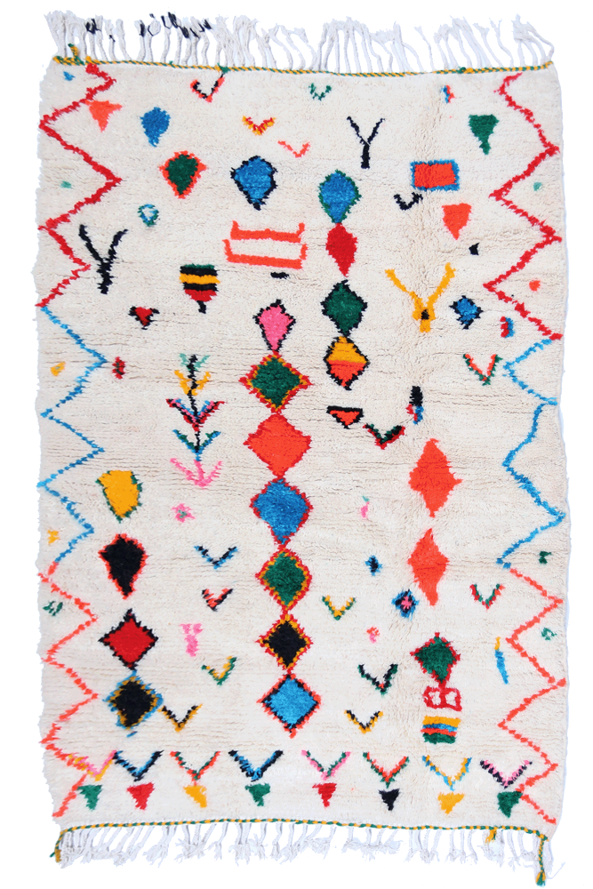 Esta alfombra bereber llamada Azilal recibe su nombre de la región de Azilal en Marruecos, donde ha sido confeccionada a mano en un telar tradicional de madera. Sus diseños representan los estados de ánimo, amores y penas de la tejedora en el momento de su creación. Una vez que se ha creado esta alfombra bereber de colores, ella creará otra totalmente diferente, dependiendo de sus emociones en ese momento. Cada pieza es única.