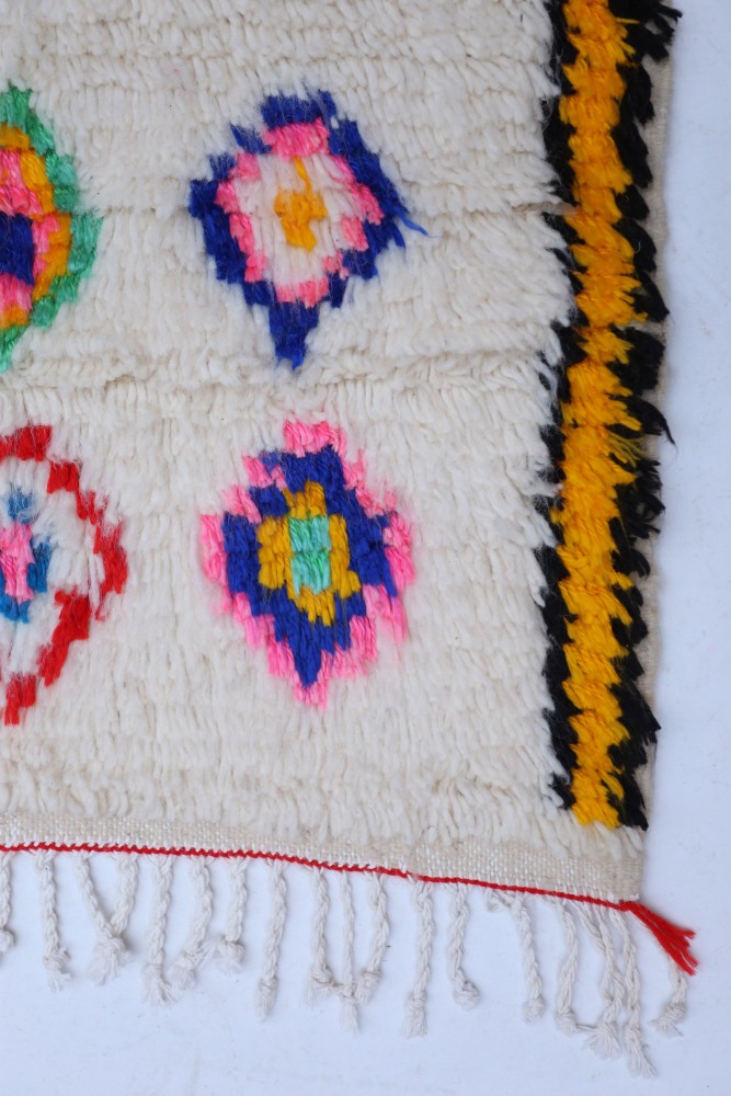 Esta alfombra bereber llamada Azilal recibe su nombre de la región de Azilal en Marruecos, donde ha sido confeccionada a mano en un telar tradicional de madera. Sus diseños representan los estados de ánimo, amores y penas de la tejedora en el momento de su creación. Una vez que se ha creado esta alfombra bereber de colores, ella creará otra totalmente diferente, dependiendo de sus emociones en ese momento. Cada pieza es única.