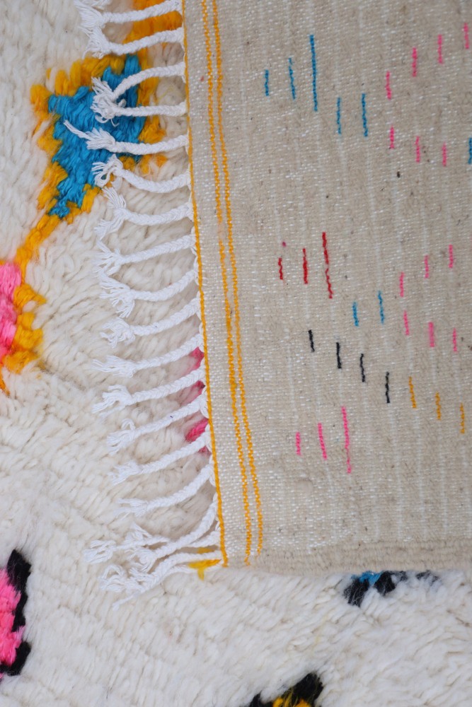 Esta alfombra bereber llamada Azilal recibe su nombre de la región de Azilal en Marruecos, donde ha sido confeccionada a mano en un telar tradicional de madera. Sus diseños representan los estados de ánimo, amores y penas de la tejedora en el momento de su creación. Una vez que se ha creado esta alfombra bereber de colores, ella creará otra totalmente diferente, dependiendo de sus emociones en ese momento. Cada pieza es única.