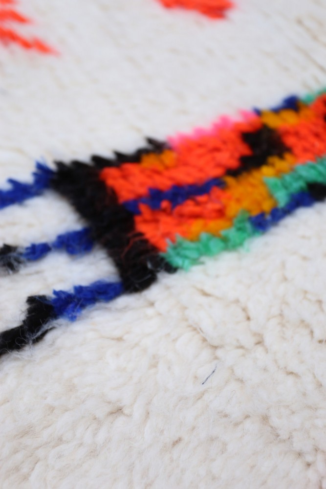 Esta alfombra bereber llamada Azilal recibe su nombre de la región de Azilal en Marruecos, donde ha sido confeccionada a mano en un telar tradicional de madera. Sus diseños representan los estados de ánimo, amores y penas de la tejedora en el momento de su creación. Una vez que se ha creado esta alfombra bereber de colores, ella creará otra totalmente diferente, dependiendo de sus emociones en ese momento. Cada pieza es única.