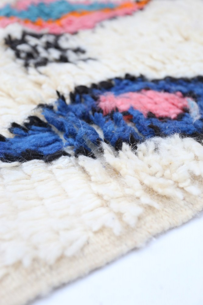 Esta alfombra bereber llamada Azilal recibe su nombre de la región de Azilal en Marruecos, donde ha sido confeccionada a mano en un telar tradicional de madera. Sus diseños representan los estados de ánimo, amores y penas de la tejedora en el momento de su creación. Una vez que se ha creado esta alfombra bereber de colores, ella creará otra totalmente diferente, dependiendo de sus emociones en ese momento. Cada pieza es única.