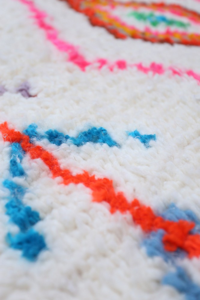 Esta alfombra bereber llamada Azilal recibe su nombre de la región de Azilal en Marruecos, donde ha sido confeccionada a mano en un telar tradicional de madera. Sus diseños representan los estados de ánimo, amores y penas de la tejedora en el momento de su creación. Una vez que se ha creado esta alfombra bereber de colores, ella creará otra totalmente diferente, dependiendo de sus emociones en ese momento. Cada pieza es única.