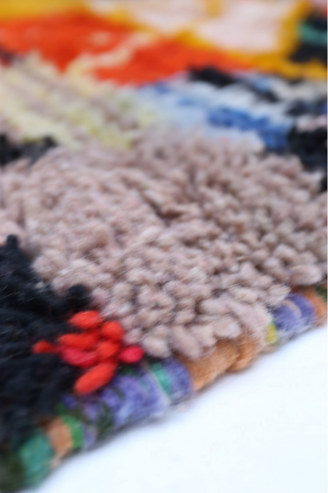 Esta alfombra bereber llamada Azilal recibe su nombre de la región de Azilal en Marruecos, donde ha sido confeccionada a mano en un telar tradicional de madera. Sus diseños representan los estados de ánimo, amores y penas de la tejedora en el momento de su creación. Una vez que se ha creado esta alfombra bereber de colores, ella creará otra totalmente diferente, dependiendo de sus emociones en ese momento. Cada pieza es única.