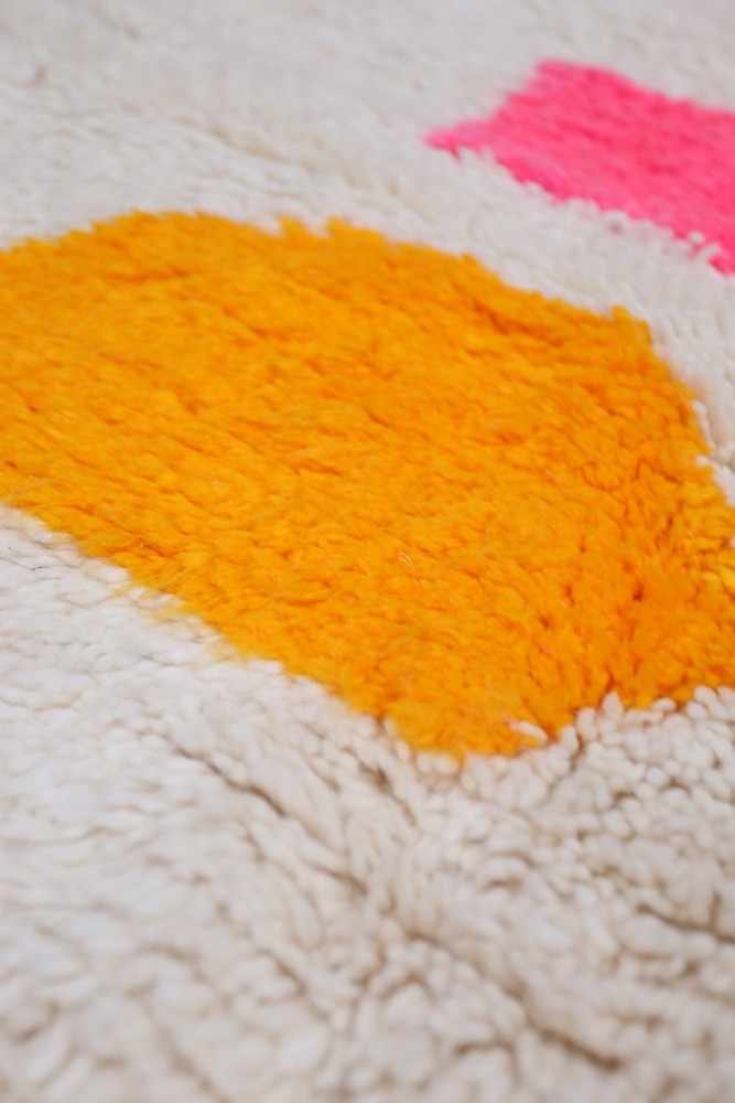 Esta alfombra bereber llamada Azilal recibe su nombre de la región de Azilal en Marruecos, donde ha sido confeccionada a mano en un telar tradicional de madera. Sus diseños representan los estados de ánimo, amores y penas de la tejedora en el momento de su creación. Una vez que se ha creado esta alfombra bereber de colores, ella creará otra totalmente diferente, dependiendo de sus emociones en ese momento. Cada pieza es única.