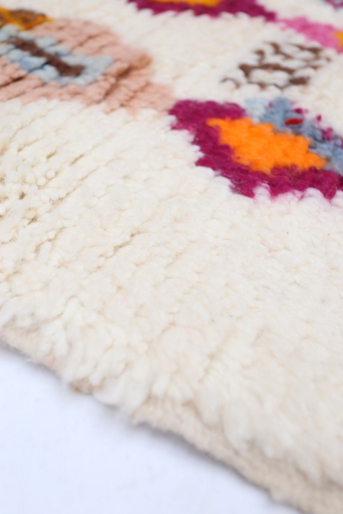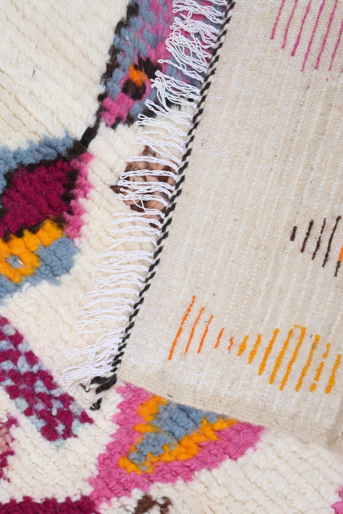 Esta alfombra bereber llamada Azilal recibe su nombre de la región de Azilal en Marruecos, donde ha sido confeccionada a mano en un telar tradicional de madera. Sus diseños representan los estados de ánimo, amores y penas de la tejedora en el momento de su creación. Una vez que se ha creado esta alfombra bereber de colores, ella creará otra totalmente diferente, dependiendo de sus emociones en ese momento. Cada pieza es única.