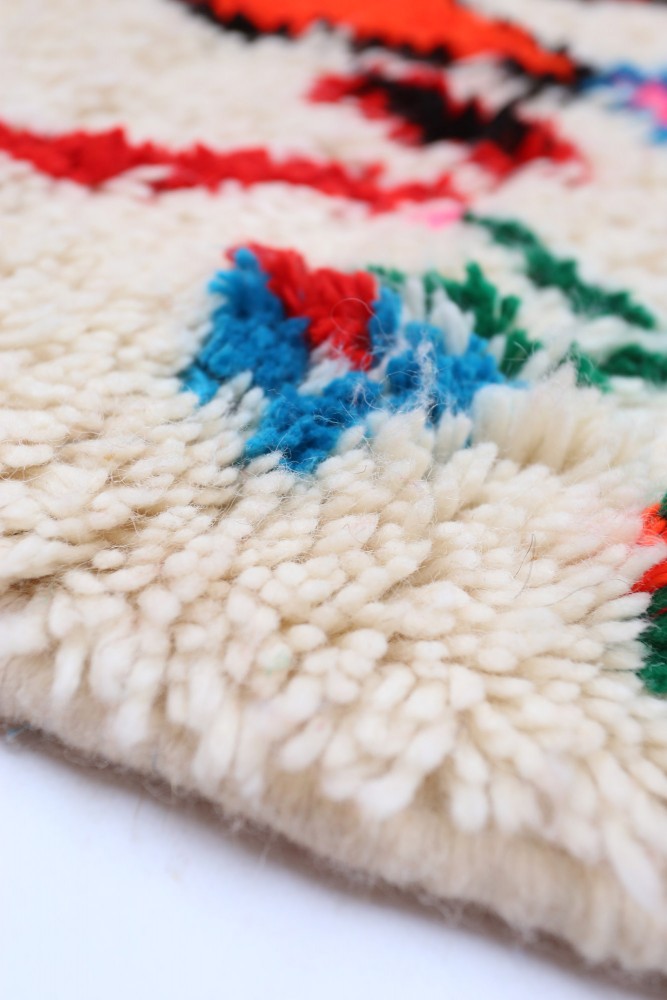 Esta alfombra bereber llamada Azilal recibe su nombre de la región de Azilal en Marruecos, donde ha sido confeccionada a mano en un telar tradicional de madera. Sus diseños representan los estados de ánimo, amores y penas de la tejedora en el momento de su creación. Una vez que se ha creado esta alfombra bereber de colores, ella creará otra totalmente diferente, dependiendo de sus emociones en ese momento. Cada pieza es única.