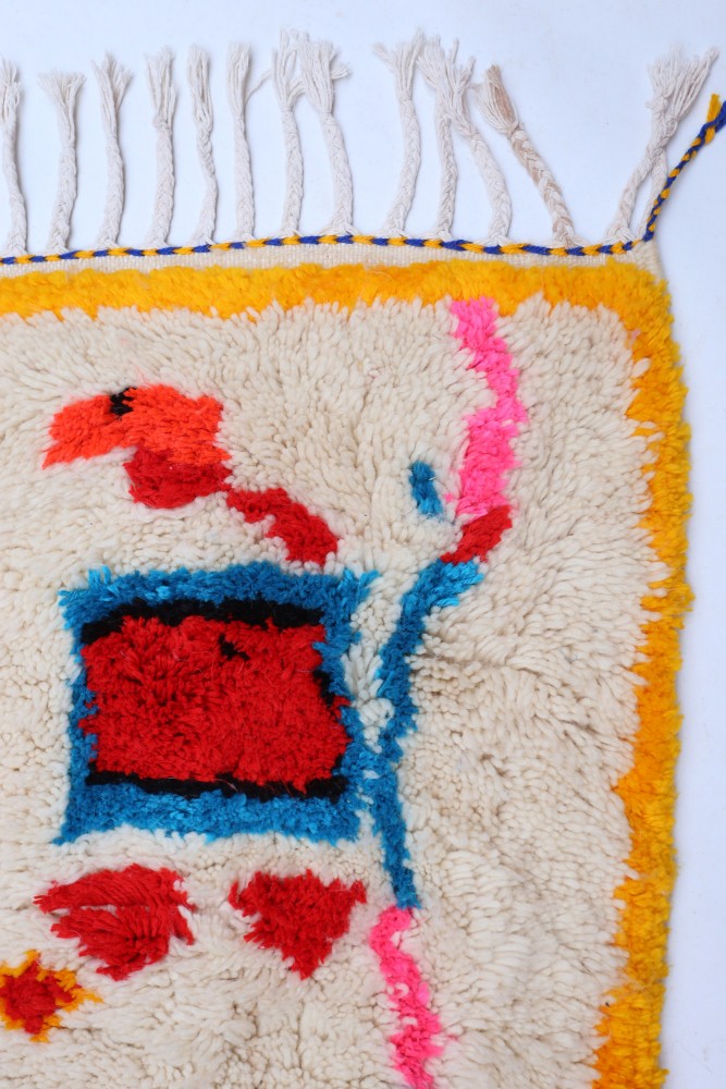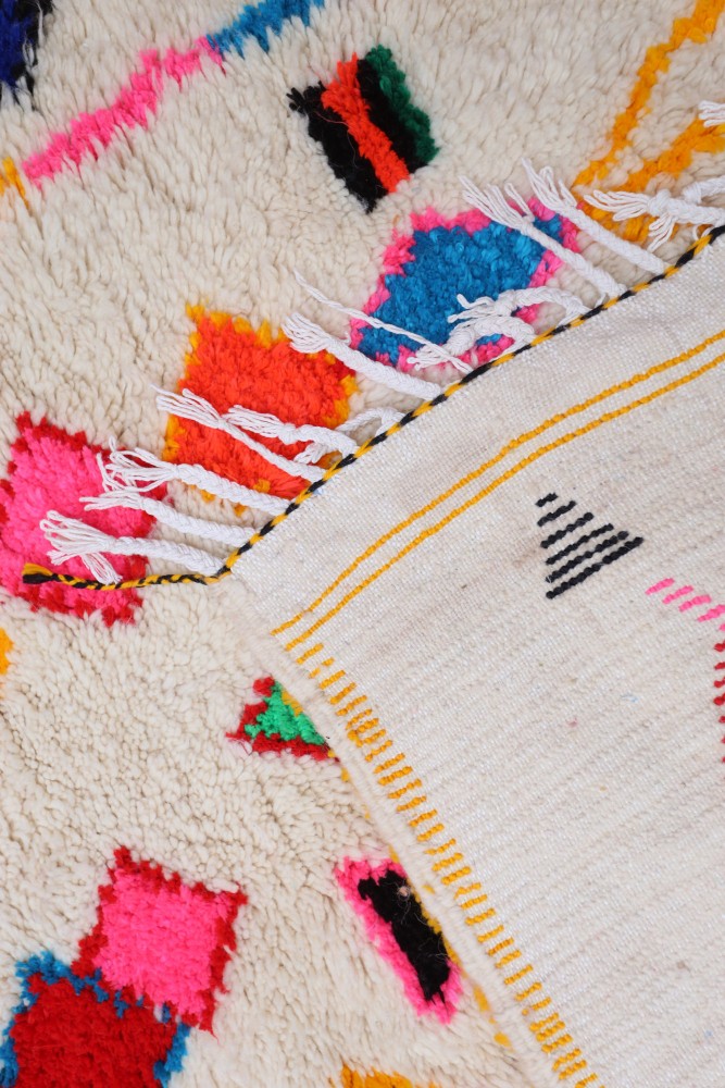Esta alfombra bereber llamada Azilal recibe su nombre de la región de Azilal en Marruecos, donde ha sido confeccionada a mano en un telar tradicional de madera. Sus diseños representan los estados de ánimo, amores y penas de la tejedora en el momento de su creación. Una vez que se ha creado esta alfombra bereber de colores, ella creará otra totalmente diferente, dependiendo de sus emociones en ese momento. Cada pieza es única.