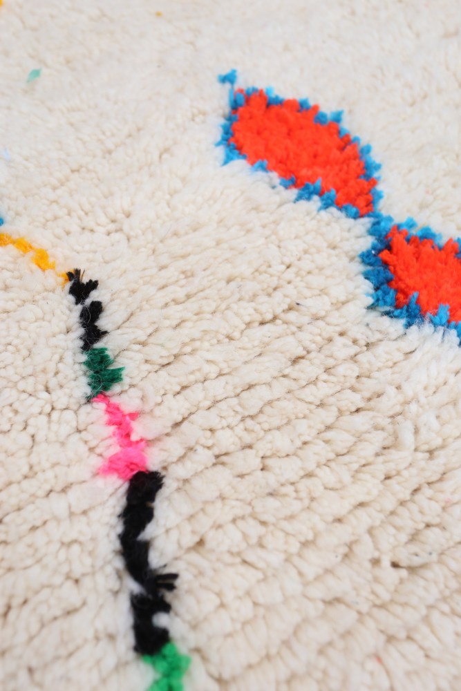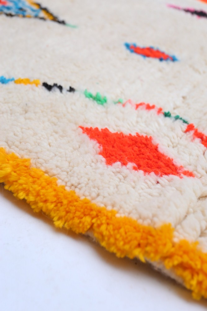 Esta alfombra bereber llamada Azilal recibe su nombre de la región de Azilal en Marruecos, donde ha sido confeccionada a mano en un telar tradicional de madera. Sus diseños representan los estados de ánimo, amores y penas de la tejedora en el momento de su creación. Una vez que se ha creado esta alfombra bereber de colores, ella creará otra totalmente diferente, dependiendo de sus emociones en ese momento. Cada pieza es única.