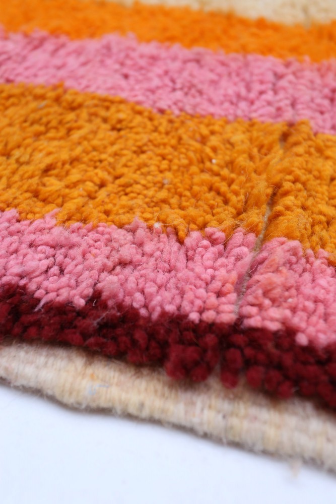 Esta alfombra bereber llamada Azilal recibe su nombre de la región de Azilal en Marruecos, donde ha sido confeccionada a mano en un telar tradicional de madera. Sus diseños representan los estados de ánimo, amores y penas de la tejedora en el momento de su creación. Una vez que se ha creado esta alfombra bereber de colores, ella creará otra totalmente diferente, dependiendo de sus emociones en ese momento. Cada pieza es única.