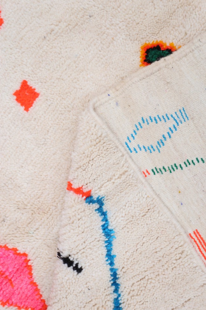 Esta alfombra bereber llamada Azilal recibe su nombre de la región de Azilal en Marruecos, donde ha sido confeccionada a mano en un telar tradicional de madera. Sus diseños representan los estados de ánimo, amores y penas de la tejedora en el momento de su creación. Una vez que se ha creado esta alfombra bereber de colores, ella creará otra totalmente diferente, dependiendo de sus emociones en ese momento. Cada pieza es única.