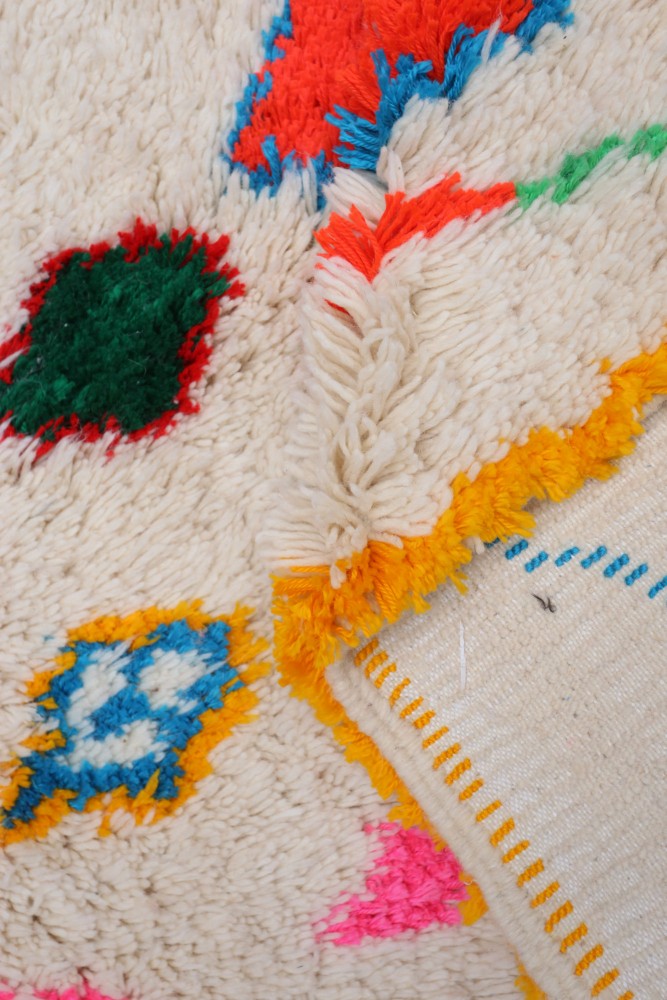 Esta alfombra bereber llamada Azilal recibe su nombre de la región de Azilal en Marruecos, donde ha sido confeccionada a mano en un telar tradicional de madera. Sus diseños representan los estados de ánimo, amores y penas de la tejedora en el momento de su creación. Una vez que se ha creado esta alfombra bereber de colores, ella creará otra totalmente diferente, dependiendo de sus emociones en ese momento. Cada pieza es única.