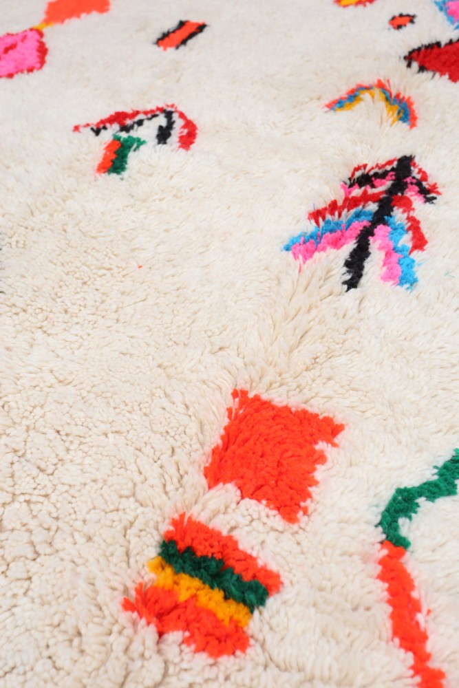Esta alfombra bereber llamada Azilal recibe su nombre de la región de Azilal en Marruecos, donde ha sido confeccionada a mano en un telar tradicional de madera. Sus diseños representan los estados de ánimo, amores y penas de la tejedora en el momento de su creación. Una vez que se ha creado esta alfombra bereber de colores, ella creará otra totalmente diferente, dependiendo de sus emociones en ese momento. Cada pieza es única.