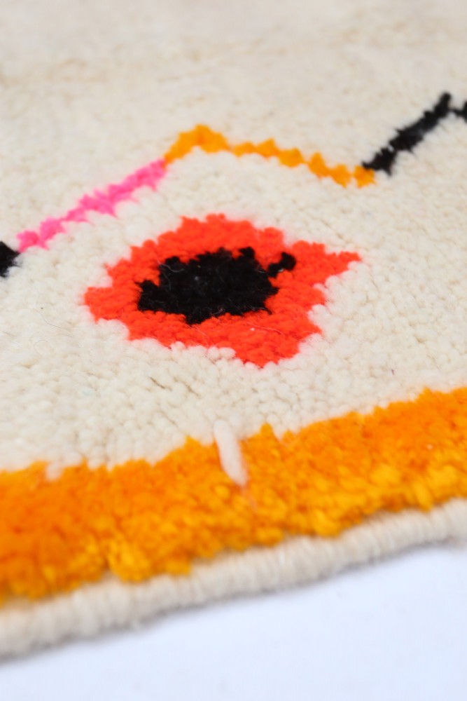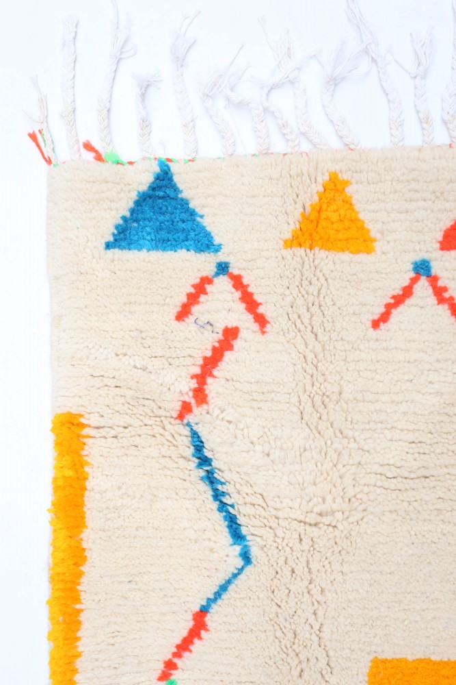 Esta alfombra bereber llamada Azilal recibe su nombre de la región de Azilal en Marruecos, donde ha sido confeccionada a mano en un telar tradicional de madera. Sus diseños representan los estados de ánimo, amores y penas de la tejedora en el momento de su creación. Una vez que se ha creado esta alfombra bereber de colores, ella creará otra totalmente diferente, dependiendo de sus emociones en ese momento. Cada pieza es única.