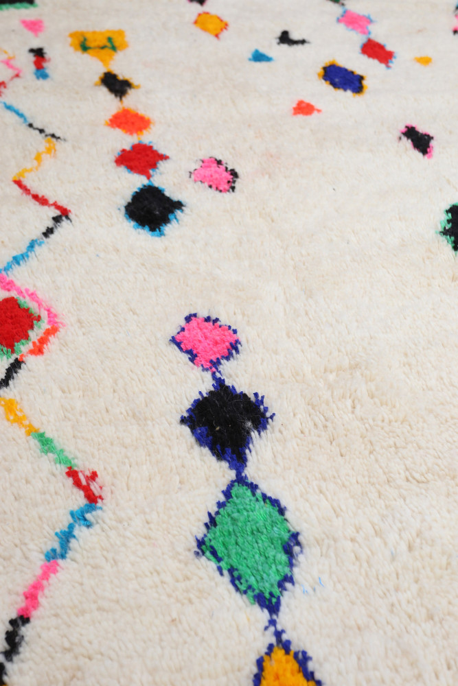 Esta alfombra bereber llamada Azilal recibe su nombre de la región de Azilal en Marruecos, donde ha sido confeccionada a mano en un telar tradicional de madera. Sus diseños representan los estados de ánimo, amores y penas de la tejedora en el momento de su creación. Una vez que se ha creado esta alfombra bereber de colores, ella creará otra totalmente diferente, dependiendo de sus emociones en ese momento. Cada pieza es única.