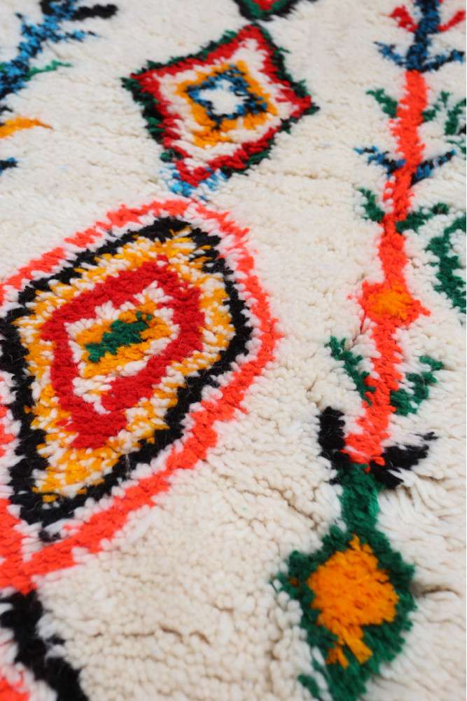 Esta alfombra bereber llamada Azilal recibe su nombre de la región de Azilal en Marruecos, donde ha sido confeccionada a mano en un telar tradicional de madera. Sus diseños representan los estados de ánimo, amores y penas de la tejedora en el momento de su creación. Una vez que se ha creado esta alfombra bereber de colores, ella creará otra totalmente diferente, dependiendo de sus emociones en ese momento. Cada pieza es única. Esta alfombra bereber representa más de un mes de tejido. Descubre en video cómo se crean las alfombras bereberes THEM haciendo clic aquí. Nuestras alfombras con un fondo blanco y diseños coloridos siempre tienen un fondo blanco de lana. Los colores pueden ser de algodón o lana. Los colores muy brillantes suelen ser de algodón y los colores con un aspecto más natural son de lana. Nuestras alfombras totalmente coloridas son 100% de lana. ENVÍO Todos los paquetes se envían desde Francia. No hay gastos de aduana para pedidos realizados en un país de la Unión Europea. Para pedidos fuera de la UE, pueden aplicarse gastos de aduana. Realizamos envíos a todo el mundo y todos los pedidos se envían cada 7 a 15 días. Para Francia: puedes elegir entre envío a punto de recogida con Mondial Relay o envío a domicilio con Colissimo. Para el resto del mundo: el costo del envío varía según el país. Simplemente agrega la alfombra al carrito, ingresa tu dirección y se te indicará el costo exacto del envío. DEVOLUCIÓN Tienes un plazo de 14 días a partir de la entrega de tu paquete para solicitar un cambio, un crédito o un reembolso. Para Francia: - Si deseas un cambio/crédito: todo es gratuito (la devolución y el envío del nuevo paquete corren por nuestra cuenta) - Si deseas un reembolso: los gastos de devolución corren por tu cuenta Para el resto del mundo: - Si deseas un cambio: los gastos de devolución corren por tu cuenta y el envío del nuevo paquete corre por nuestra cuenta - Si deseas un reembolso: los gastos de devolución corren por tu cuenta Sorprendentemente, las alfombras bereberes se cuidan fácilmente. Hay que tener en cuenta que estas piezas cargadas de historia no tienen como objetivo principal ser un objeto decorativo. Las mujeres bereberes las tejen y las utilizan como cobertor o alfombra para aislamiento. La calidad excepcional del tejido permite que las alfombras bereberes se mantengan con el tiempo y envejezcan muy bien. Para su cuidado, puedes pasar la aspiradora sobre ella una vez por semana como máximo para no dañar la lana. Si no puedes sacudirla, dale la vuelta durante unas horas una vez al mes, todas las partículas de polvo caerán en profundidad. En caso de mancha, simplemente golpea con un paño húmedo, a menudo es suficiente. De lo contrario, agrega vinagre de alcohol o jabón de Marsella con mucha agua.Más información