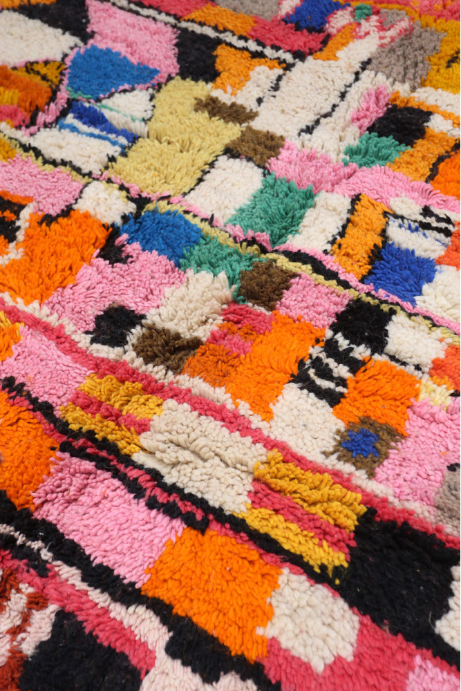 Esta alfombra bereber llamada Azilal recibe su nombre de la región de Azilal en Marruecos, donde ha sido confeccionada a mano en un telar tradicional de madera. Sus diseños representan los estados de ánimo, amores y penas de la tejedora en el momento de su creación. Una vez que se ha creado esta alfombra bereber de colores, ella creará otra totalmente diferente, dependiendo de sus emociones en ese momento. Cada pieza es única.