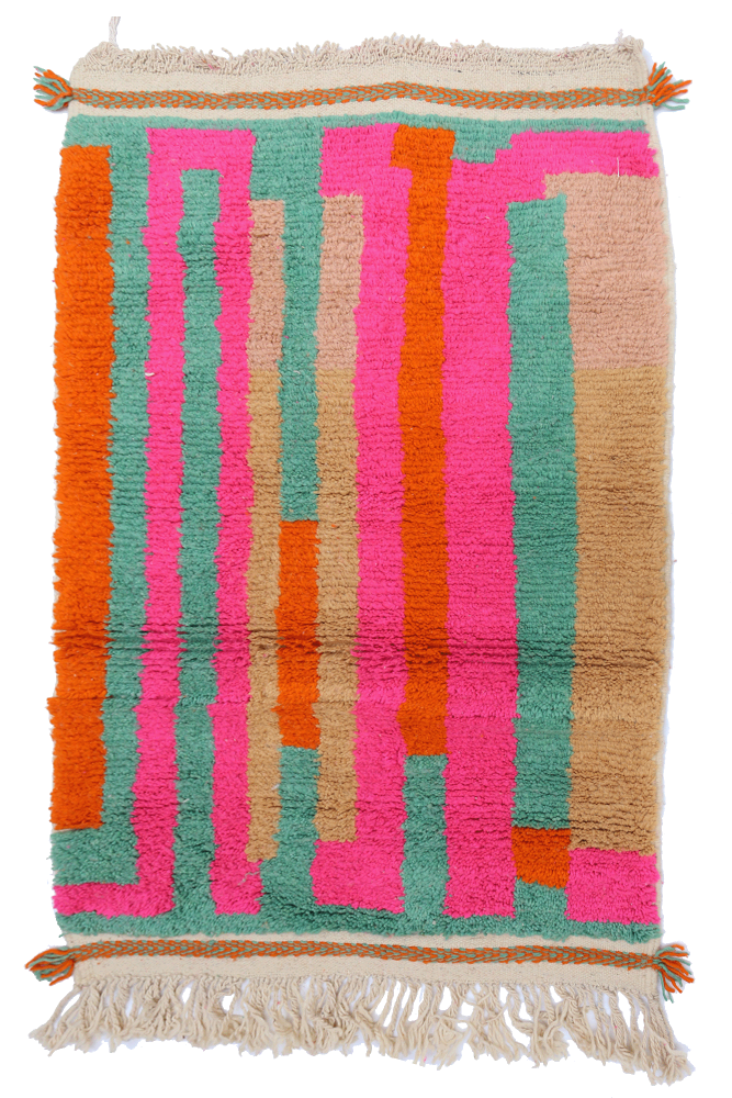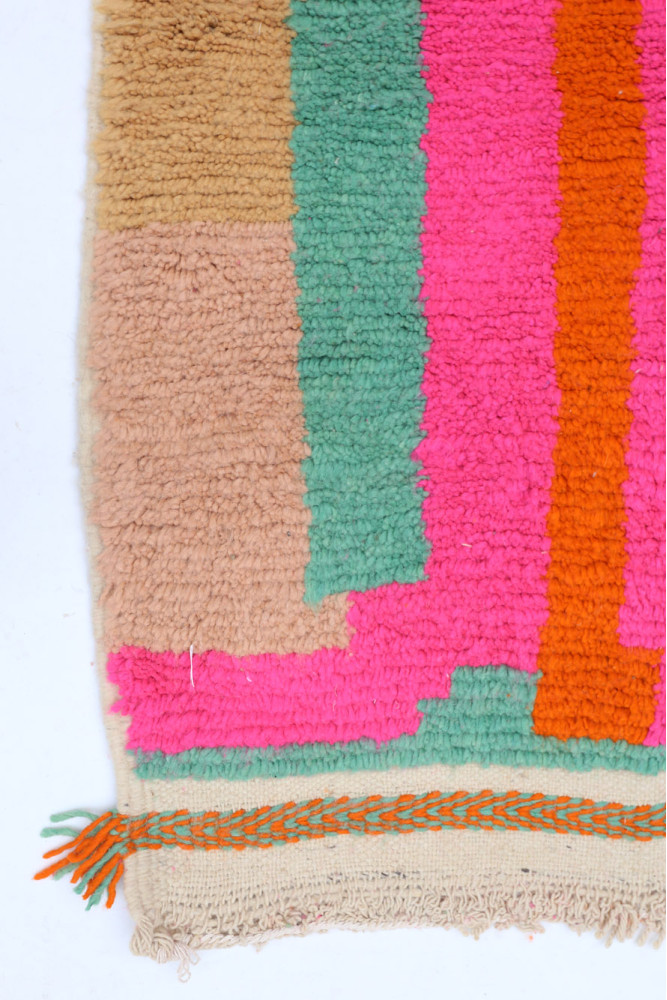 Esta alfombra bereber llamada Azilal recibe su nombre de la región de Azilal en Marruecos, donde ha sido confeccionada a mano en un telar tradicional de madera. Sus diseños representan los estados de ánimo, amores y penas de la tejedora en el momento de su creación. Una vez que se ha creado esta alfombra bereber de colores, ella creará otra totalmente diferente, dependiendo de sus emociones en ese momento. Cada pieza es única.