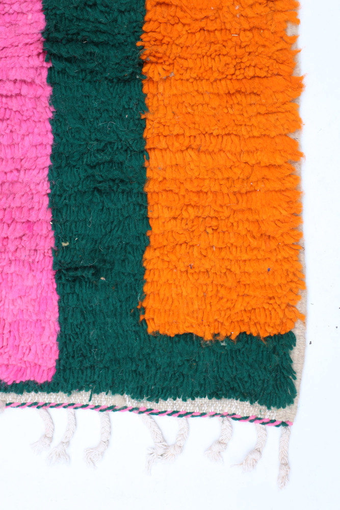 Esta alfombra bereber llamada Azilal recibe su nombre de la región de Azilal en Marruecos, donde ha sido confeccionada a mano en un telar tradicional de madera. Sus diseños representan los estados de ánimo, amores y penas de la tejedora en el momento de su creación. Una vez que se ha creado esta alfombra bereber de colores, ella creará otra totalmente diferente, dependiendo de sus emociones en ese momento. Cada pieza es única.