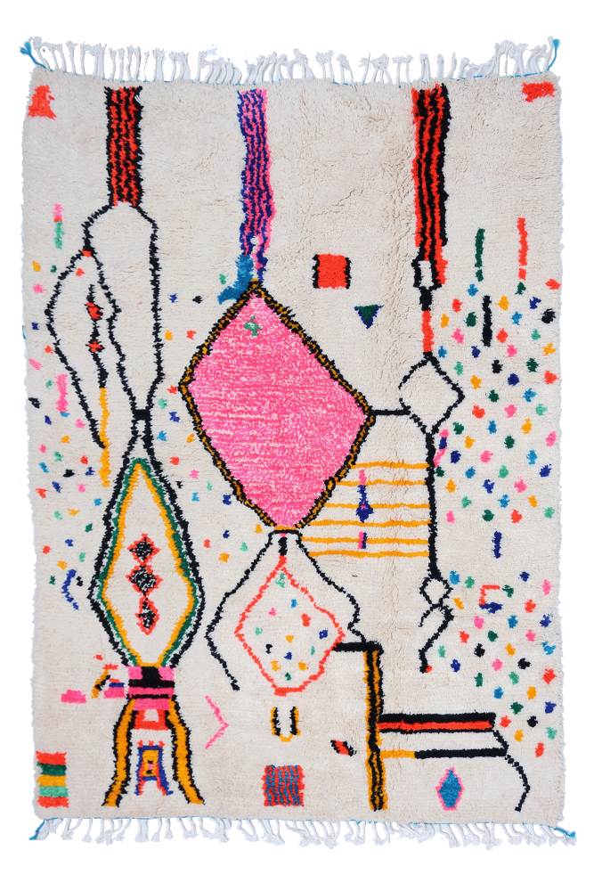 Esta alfombra bereber llamada Azilal recibe su nombre de la región de Azilal en Marruecos, donde ha sido confeccionada a mano en un telar tradicional de madera. Sus diseños representan los estados de ánimo, amores y penas de la tejedora en el momento de su creación. Una vez que se ha creado esta alfombra bereber de colores, ella creará otra totalmente diferente, dependiendo de sus emociones en ese momento. Cada pieza es única.