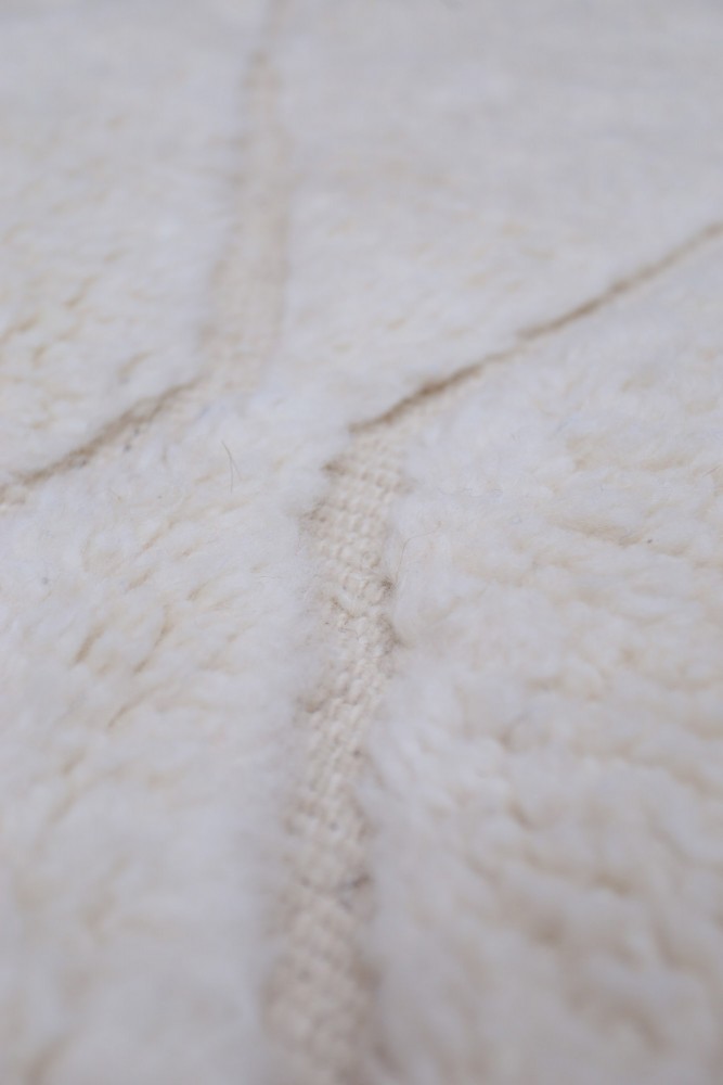 Para su cuidado, puedes aspirarla una vez por semana como máximo para no dañar la lana. Si no puedes sacudirla, dale la vuelta durante unas horas una vez al mes, todas las partículas de polvo caerán en profundidad. En caso de mancha, simplemente frota con un paño húmedo, a menudo es suficiente. De lo contrario, agrega vinagre o jabón de Marsella con mucha agua.