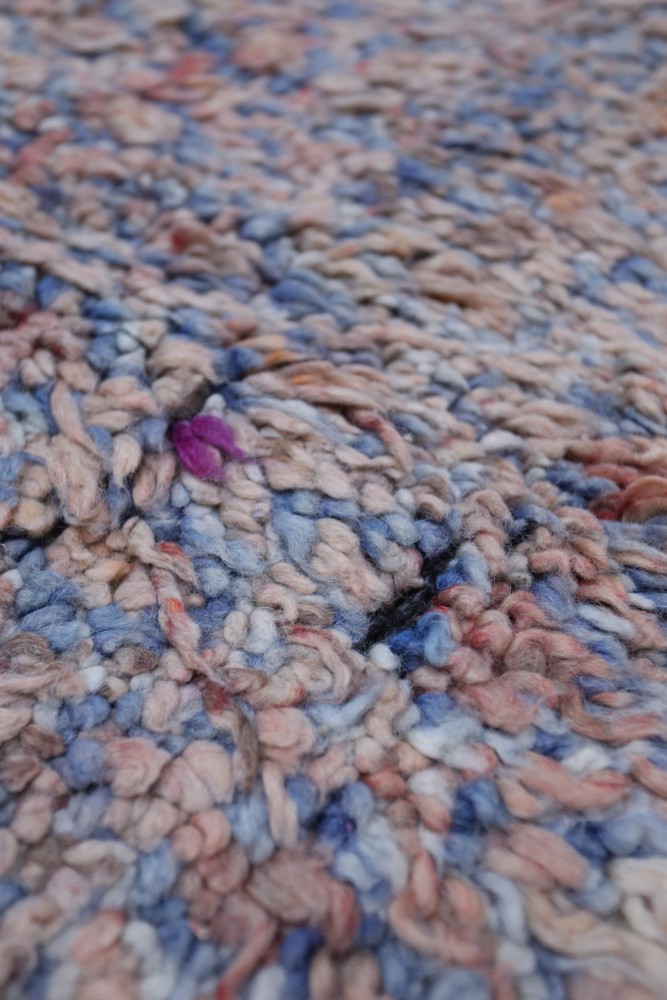 Esta alfombra bereber llamada Azilal recibe su nombre de la región de Azilal en Marruecos, donde ha sido confeccionada a mano en un telar tradicional de madera. Sus diseños representan los estados de ánimo, amores y penas de la tejedora en el momento de su creación. Una vez que se ha creado esta alfombra bereber de colores, ella creará otra totalmente diferente, dependiendo de sus emociones en ese momento. Cada pieza es única.