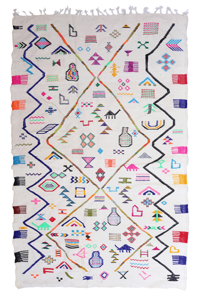Esta alfombra bereber llamada Azilal recibe su nombre de la región de Azilal en Marruecos, donde ha sido confeccionada a mano en un telar tradicional de madera. Sus diseños representan los estados de ánimo, amores y penas de la tejedora en el momento de su creación. Una vez que se ha creado esta alfombra bereber de colores, ella creará otra totalmente diferente, dependiendo de sus emociones en ese momento. Cada pieza es única.