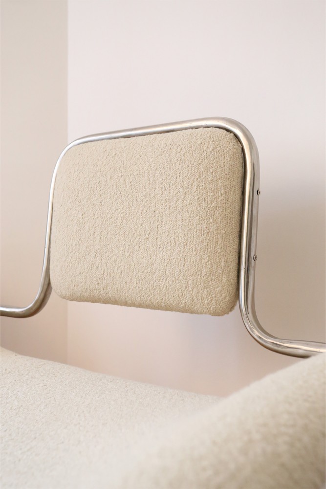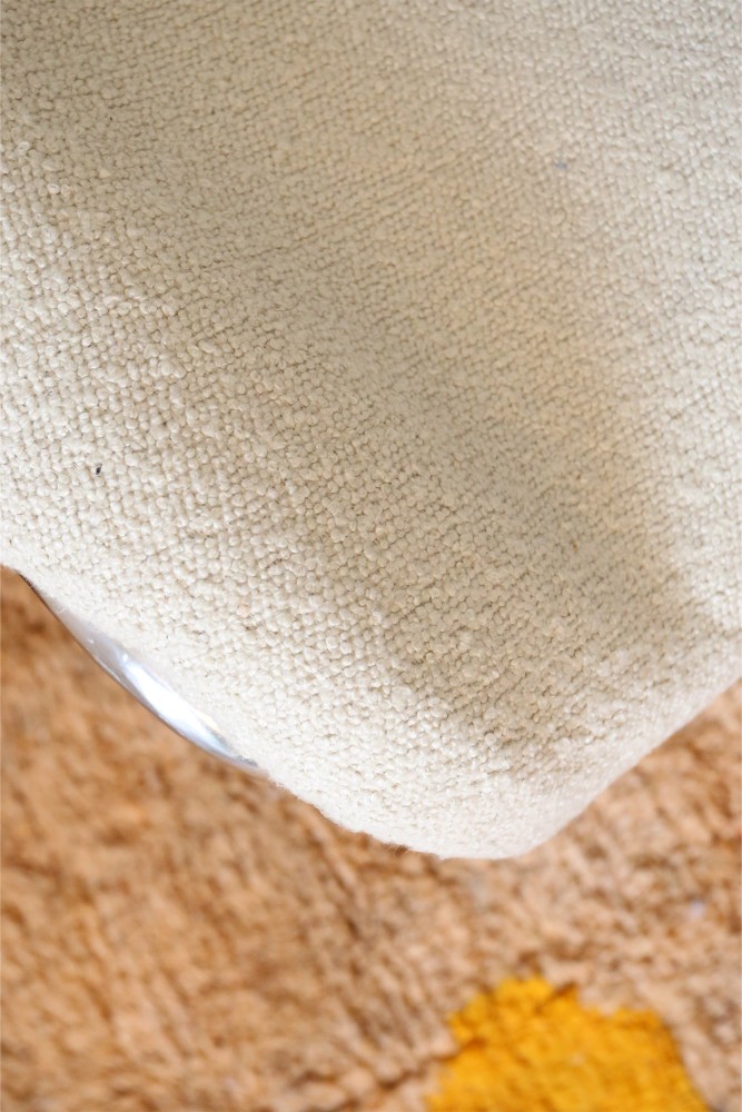 Sillón de lana bouclé color crema y acero inoxidable diseñado por Marion, la fundadora de THEM, y confeccionado de forma 100% artesanal en Marruecos en uno de nuestros talentosos talleres colaboradores.