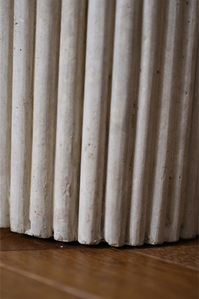 Mesa alta de travertino beige hecha a mano en Marruecos con una base redonda a rayas.