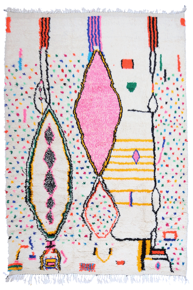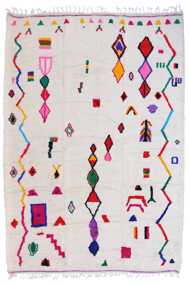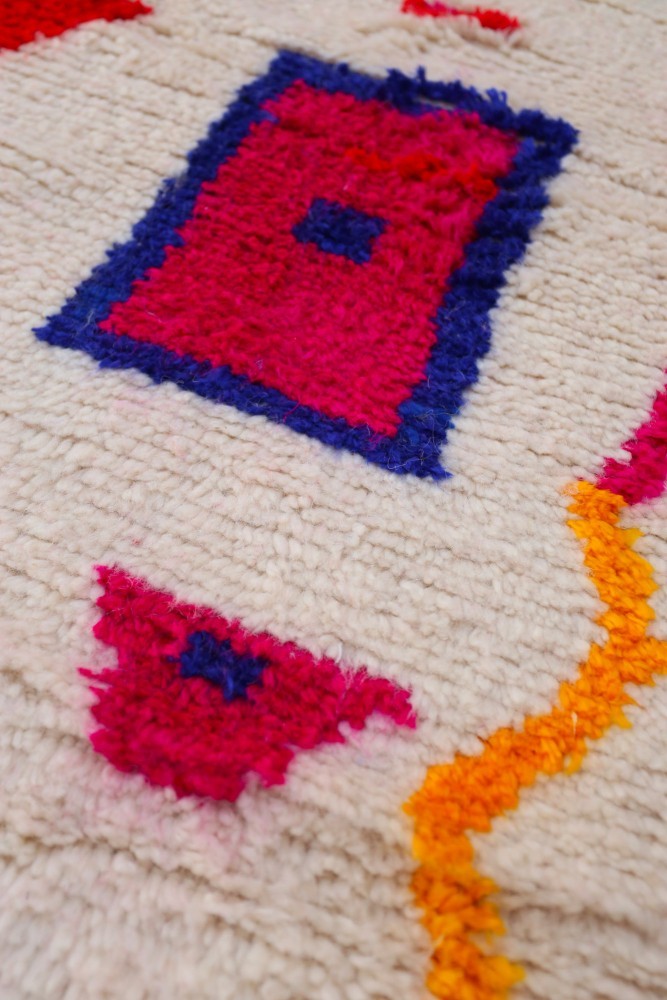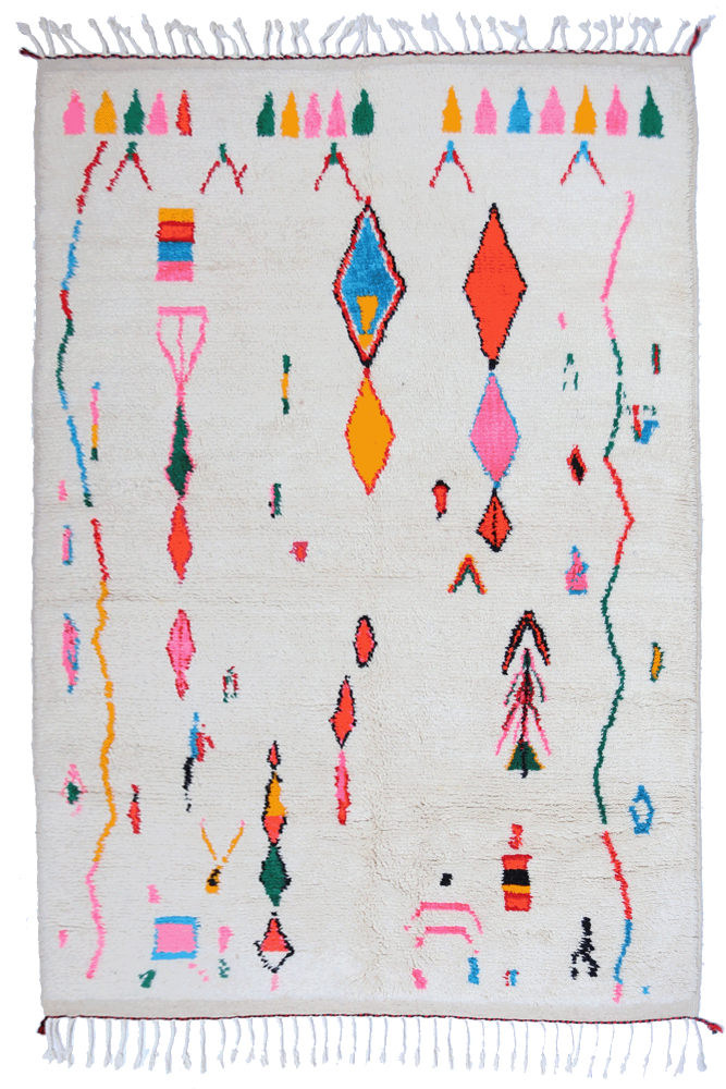 Le géant tapis berbère se pare de motifs, dessins et lignes géométriques. Ces symboles représentent l’histoire des tribus et/ou des tisserandes. Nous y voyons un design esthétique, mais il s'agit en réalité d'une écriture tribale porteuse de messages comme la fertilité, la famille, la protection, la nature, etc. Le tapis berbère losange ou encore le tapis berbère à pois sont les plus courants, mais il existe aussi des symboles comme les chevrons, les zigzags et les triangles. Chaque tapis marocain est unique et raconte son histoire. Mais si vous préférez un tapis berbère uni, vous trouverez également votre bonheur sur notre boutique en ligne, avec de grands tapis aux couleurs unies pour harmoniser une décoration monochrome ou au contraire jouer sur l'effet colorblock. Par exemple, un grand tapis berbère beige peut être égayé par une superposition d'un petit tapis berbère bleu ou d'un petit tapis berbère coloré. Les modèles unis sont aussi très tendance.