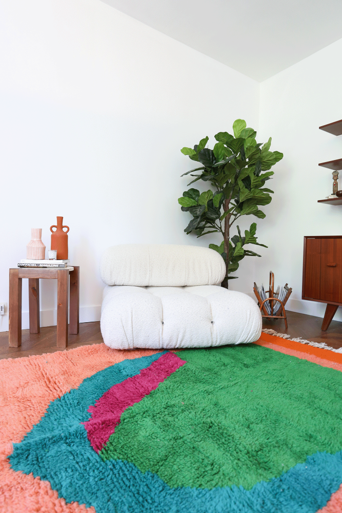 Si vous avez une pièce de vie à la décoration épurée, les couleurs sobres d’un tapis Béni Ouarain sauront se fondre à la perfection. Mais si vous avez envie d’un peu plus de vivacité au niveau des couleurs, un tapis Azilal permettra d’équilibrer les tonalités. Un tapis berbère moyen peut également se positionner dans une chambre d’enfant, surtout un tapis Kilim avec ses teintes douces et vives. Dans le cadre d’une déco bohème chic, un tapis Boucherouite ou un tapis Boujad offrent de la finesse et de l’élégance. En fonction du modèle choisi, le tapis berbère moyen devient donc une pièce maîtresse à part entière. Vous pouvez la positionner sur le sol ou sur vos murs pour plus d’originalité. Votre décoration sera totalement à votre image puisque les tapis nomades se déclinent dans de nombreux styles, que ce soit en termes de couleurs, de motifs, de lignes et de symboles.