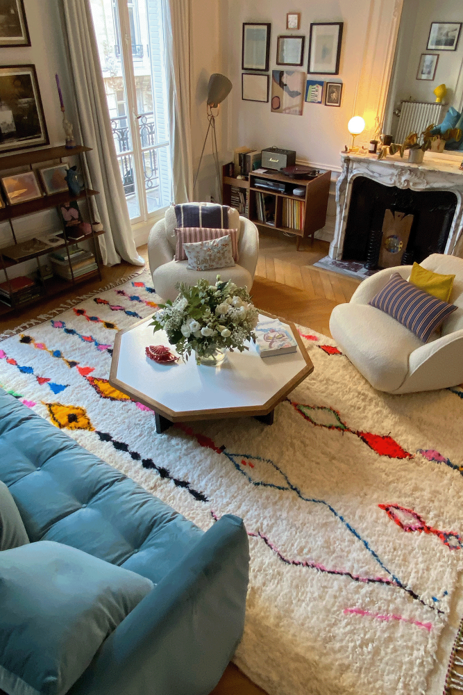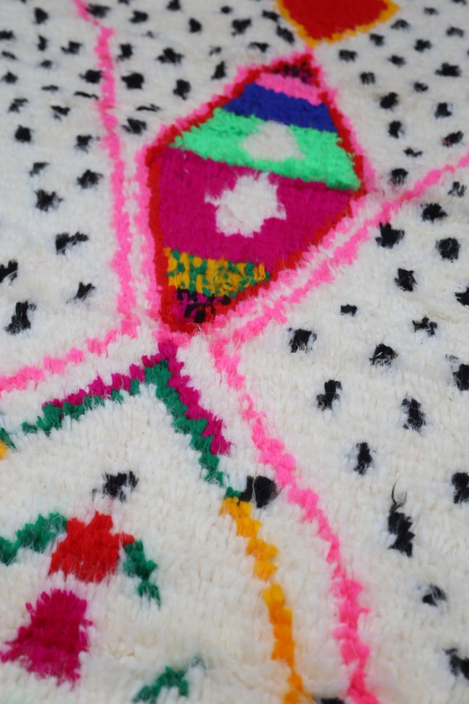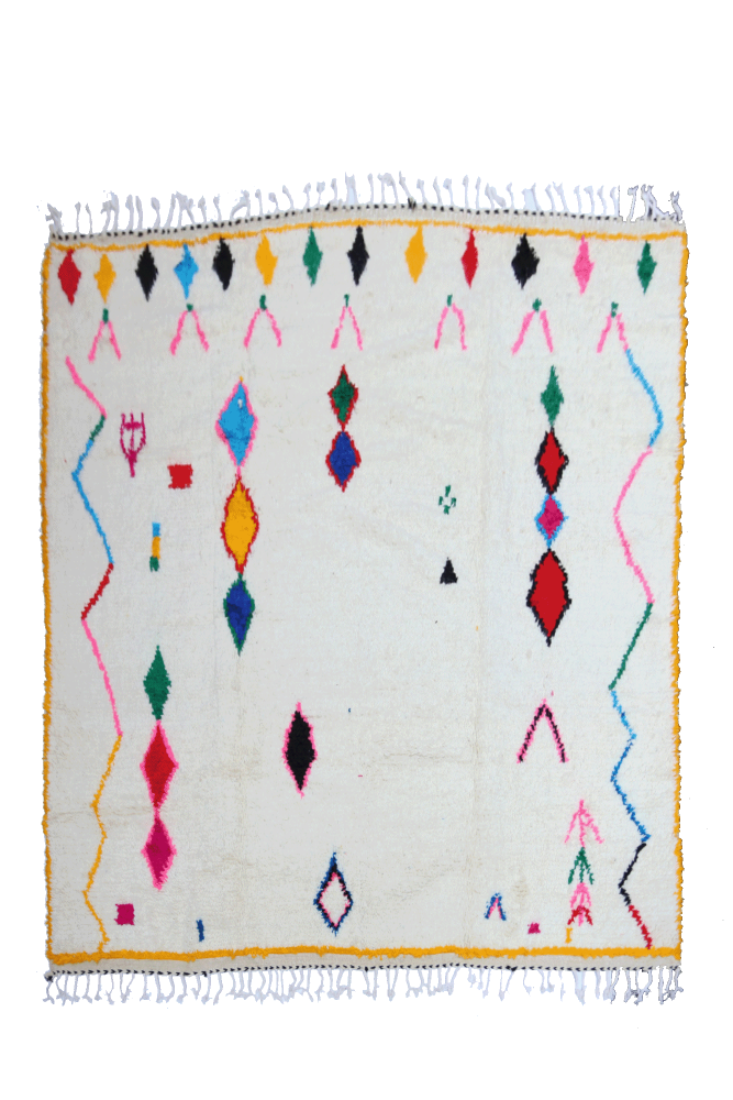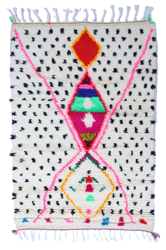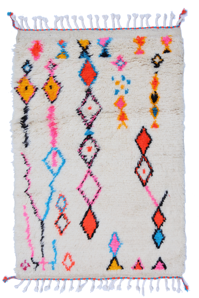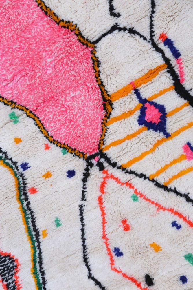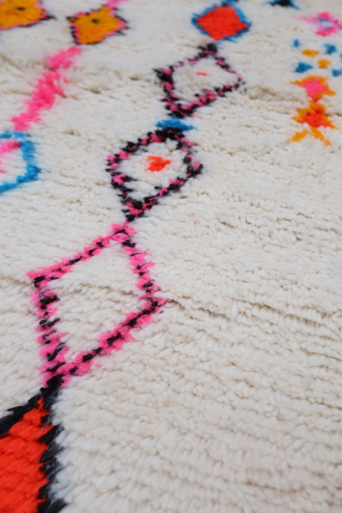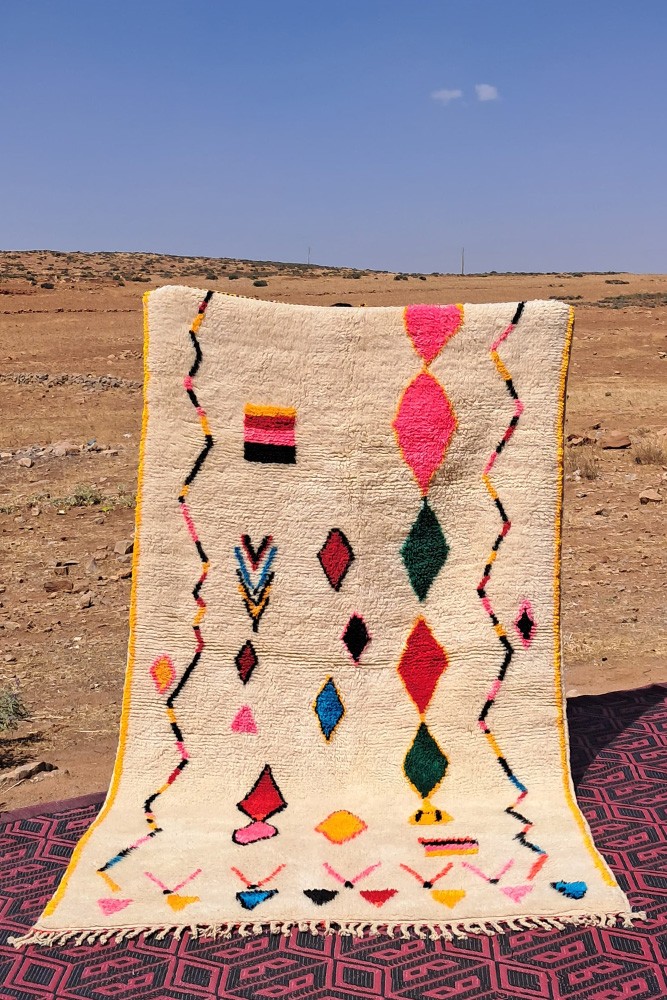 Le tapis Azilal provient d’une tribu de la région rocheuse et haute d’Azilal, qui se trouve dans les montagnes du Haut Atlas. Ce tapis berbère rouge possède de nombreux motifs abstraits avec plusieurs symboles berbères. Ce tapis avec poils longs ou avec poils courts met en avant la couleur, souvent sur fond beige, blanc ou écru. Vous pouvez trouver des modèles qui valorisent la couleur rouge avec des motifs géométriques symbolisant la fertilité, la protection, la nature, la chance ou le foyer (les motifs seront principalement des losanges, on retrouve moins de tapis berbère à pois pour la tribu Azilal). Ces modèles de tapis marocains sont souvent associés à des tapis berbères fluos de par leur mélange de couleurs vives et chatoyantes.