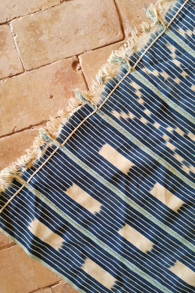 Ce tissu nommé Bogolan était autrefois utilisé comme pagne nouée chez les femmes Maliennes. Tissé à la main, il était ensuite teint à base d’éléments naturels venant de la terre et était considéré comme imprégné d’énergies vitales. Quelques heures au soleil permettaient aux pigments de se fixer.