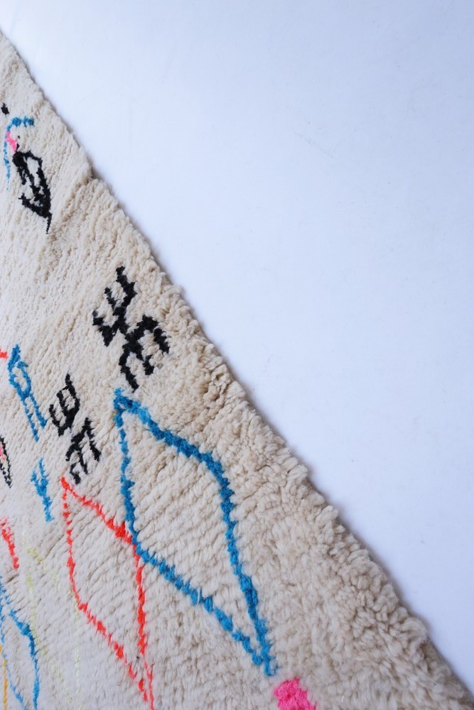 Ce tapis berbère que l'on appelle Azilal tient son nom de la région d'Azilal au Maroc où il a été confectionné à la main sur un métier à tisser traditionnel en bois. Ses motifs représentent les humeurs, les amours, les peines de la tisseuse au moment de sa création. Une fois ce tapis berbère coloré créé, elle en confectionnera un autre totalement différent, en fonction de ses émotions du moment. Chaque pièce est donc unique.