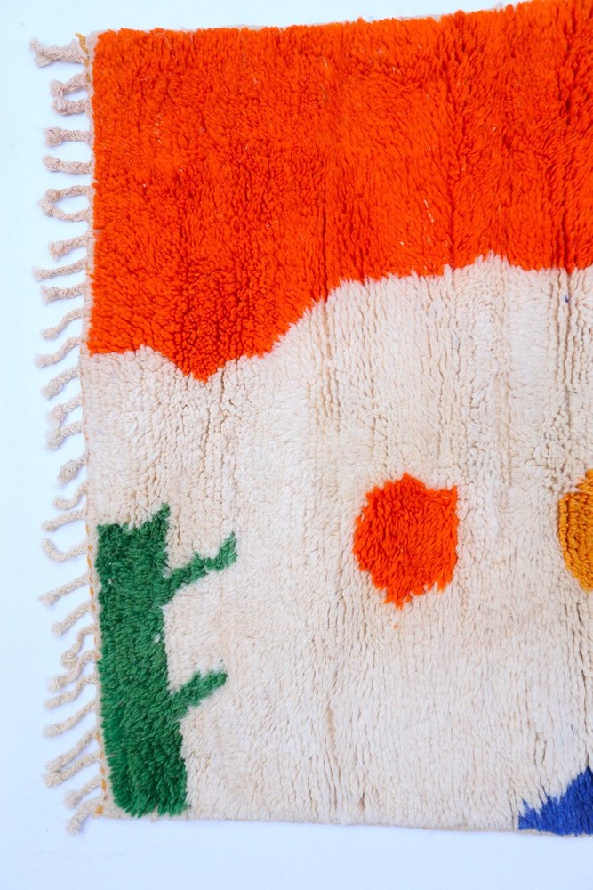 Ce tapis berbère que l'on appelle Azilal tient son nom de la région d'Azilal au Maroc où il a été confectionné à la main sur un métier à tisser traditionnel en bois. Ses motifs représentent les humeurs, les amours, les peines de la tisseuse au moment de sa création. Une fois ce tapis berbère coloré créé, elle en confectionnera un autre totalement différent, en fonction de ses émotions du moment. Chaque pièce est donc unique.