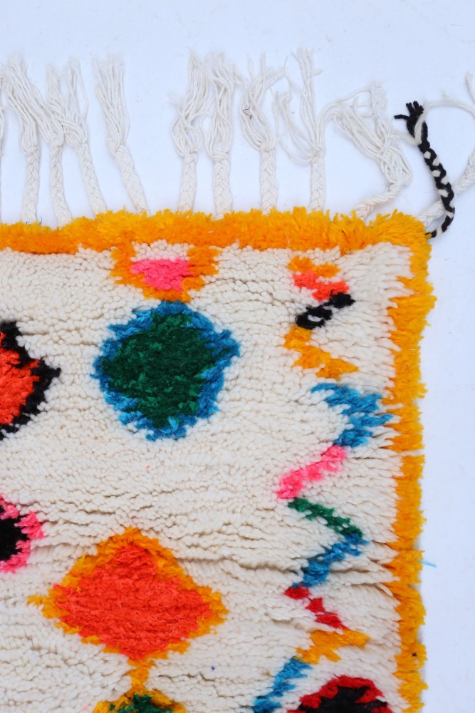 Petit tapis berbère Azilal blanc avec motifs rose vert bleu et contour jaune