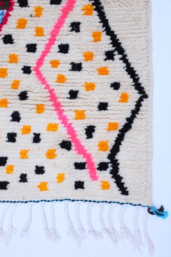 Petit tapis berbère Azilal blanc avec des pois et motifs en noir rose vert bleu et jaune