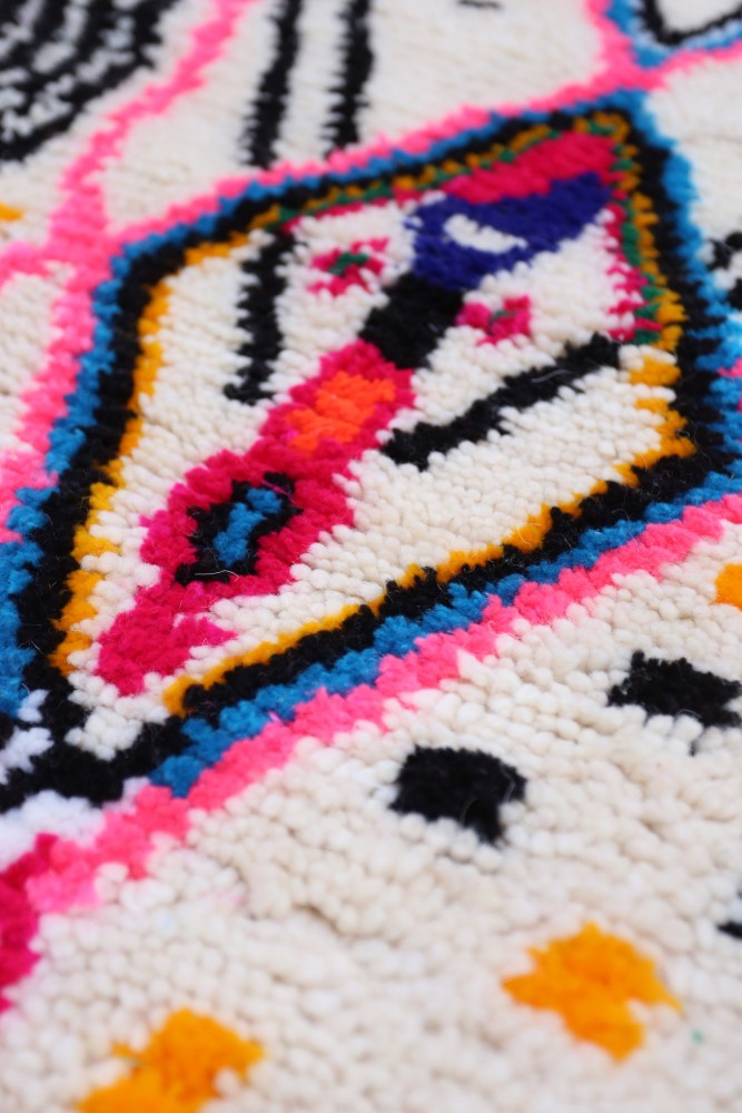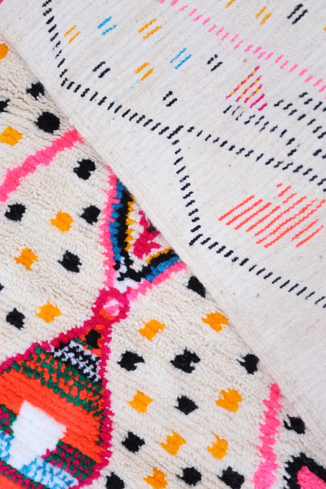 Ce tapis berbère que l'on appelle Azilal tient son nom de la région d'Azilal au Maroc où il a été confectionné à la main sur un métier à tisser traditionnel en bois. Ses motifs représentent les humeurs, les amours, les peines de la tisseuse au moment de sa création. Une fois ce tapis berbère coloré créé, elle en confectionnera un autre totalement différent, en fonction de ses émotions du moment. Chaque pièce est donc unique.