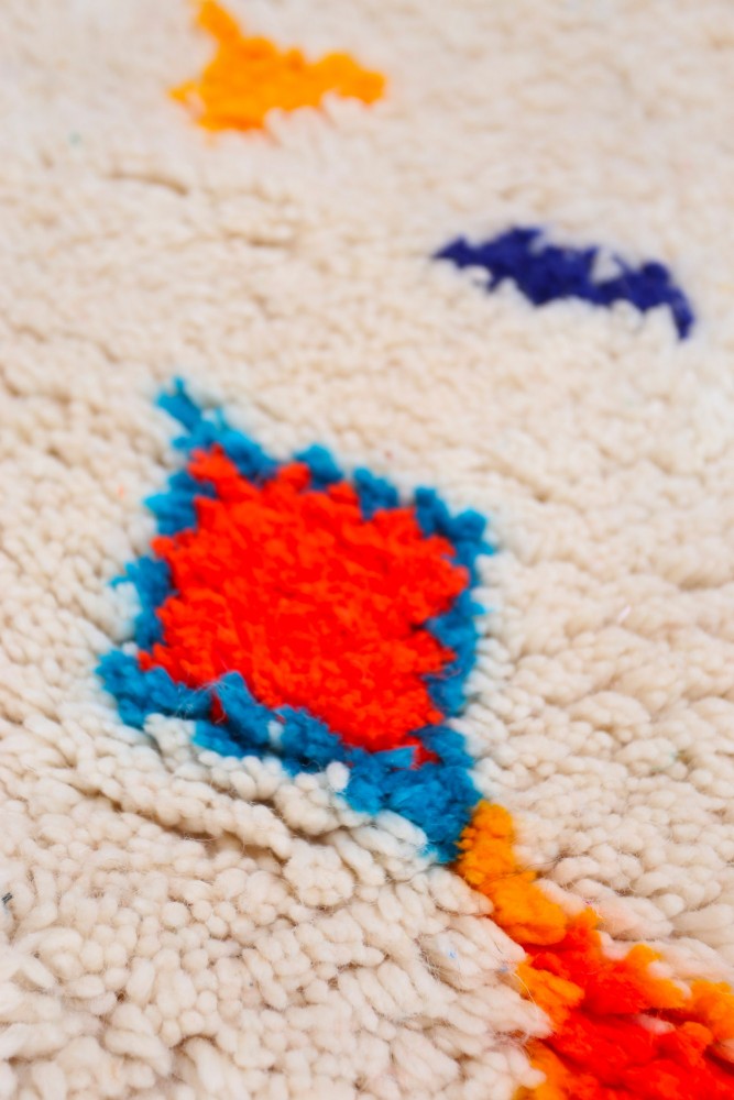 Ce tapis berbère que l'on appelle Azilal tient son nom de la région d'Azilal au Maroc où il a été confectionné à la main sur un métier à tisser traditionnel en bois. Ses motifs représentent les humeurs, les amours, les peines de la tisseuse au moment de sa création. Une fois ce tapis berbère coloré créé, elle en confectionnera un autre totalement différent, en fonction de ses émotions du moment. Chaque pièce est donc unique.