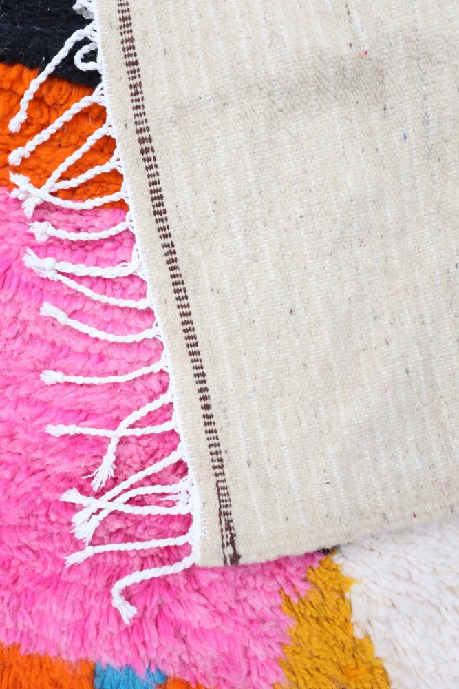 Ce tapis berbère que l'on appelle Azilal tient son nom de la région d'Azilal au Maroc où il a été confectionné à la main sur un métier à tisser traditionnel en bois. Ses motifs représentent les humeurs, les amours, les peines de la tisseuse au moment de sa création. Une fois ce tapis berbère coloré créé, elle en confectionnera un autre totalement différent, en fonction de ses émotions du moment. Chaque pièce est donc unique.