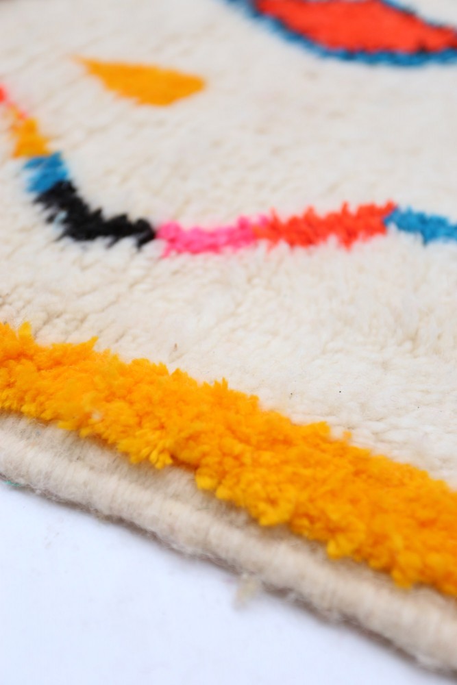 Ce tapis berbère que l'on appelle Azilal tient son nom de la région d'Azilal au Maroc où il a été confectionné à la main sur un métier à tisser traditionnel en bois. Ses motifs représentent les humeurs, les amours, les peines de la tisseuse au moment de sa création. Une fois ce tapis berbère coloré créé, elle en confectionnera un autre totalement différent, en fonction de ses émotions du moment. Chaque pièce est donc unique.