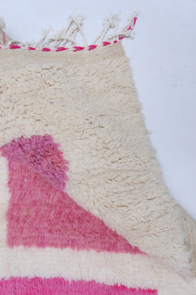 Ce tapis berbère que l'on appelle Azilal tient son nom de la région d'Azilal au Maroc où il a été confectionné à la main sur un métier à tisser traditionnel en bois. Ses motifs représentent les humeurs, les amours, les peines de la tisseuse au moment de sa création. Une fois ce tapis berbère coloré créé, elle en confectionnera un autre totalement différent, en fonction de ses émotions du moment. Chaque pièce est donc unique.