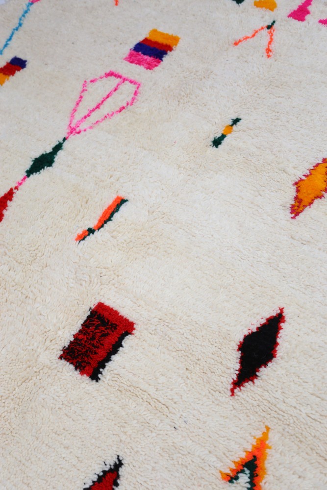 Ce tapis berbère que l'on appelle Azilal tient son nom de la région d'Azilal au Maroc où il a été confectionné à la main sur un métier à tisser traditionnel en bois. Ses motifs représentent les humeurs, les amours, les peines de la tisseuse au moment de sa création. Une fois ce tapis berbère coloré créé, elle en confectionnera un autre totalement différent, en fonction de ses émotions du moment. Chaque pièce est donc unique.