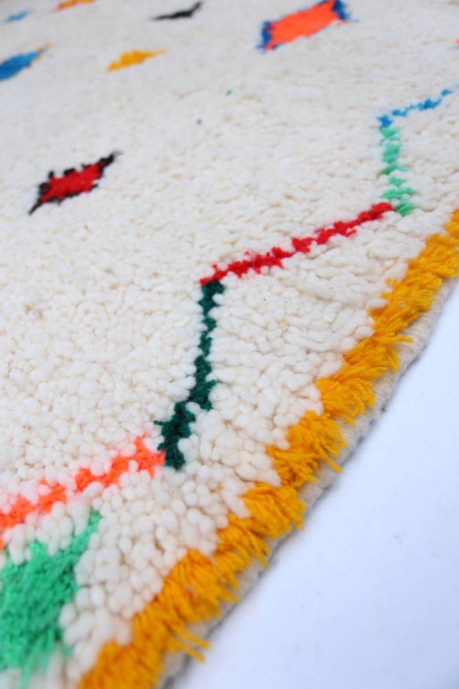 Ce tapis berbère que l'on appelle Azilal tient son nom de la région d'Azilal au Maroc où il a été confectionné à la main sur un métier à tisser traditionnel en bois. Ses motifs représentent les humeurs, les amours, les peines de la tisseuse au moment de sa création. Une fois ce tapis berbère coloré créé, elle en confectionnera un autre totalement différent, en fonction de ses émotions du moment. Chaque pièce est donc unique.