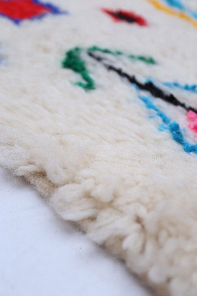 Ce tapis berbère que l'on appelle Azilal tient son nom de la région d'Azilal au Maroc où il a été confectionné à la main sur un métier à tisser traditionnel en bois. Ses motifs représentent les humeurs, les amours, les peines de la tisseuse au moment de sa création. Une fois ce tapis berbère coloré créé, elle en confectionnera un autre totalement différent, en fonction de ses émotions du moment. Chaque pièce est donc unique.